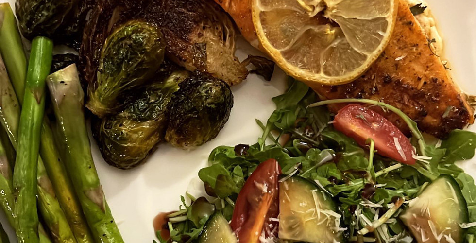 Honey Garlic Salmon w/ Roasted Potatoes, Brussels Sprouts, Asparagus, and Garden Salad